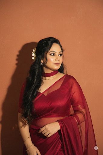shoulders. She is wearing a translucent, elegant red saree draped over one shoulder, revealing a fitted blouse underneath. White flowers are tucked behind her right ear.She is wearing minimal jewellery.She is looking slightly to her right, with a soft, serene expression. I want same face as I uploaded no alternation 100 percent same. The background is a plain, warm-toned wall, illuminated by a warm light source from the right, creating a distinct, soft-edged shadow of her profile and hair on the wall behind her. The overall mood is retro and artistic.”