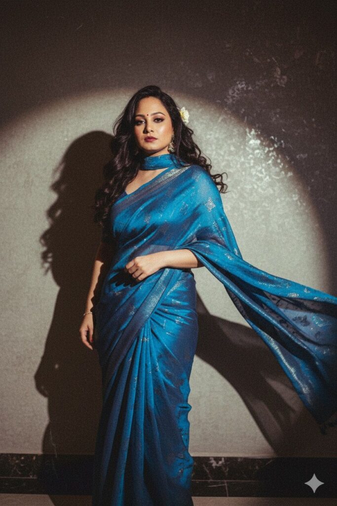 Create a retro vintage grainy but bright image of the reference picture but draped a perfect blue Pinteresty aesthetic reti? saree. it must feel like a 90’s movie red hai baddie with a small flower tuck visibly@ t curls and windy environment romanticisin The girl is standing against a solid walde shadows and contrast drama, creating a mysterious and artistic atmosphere.