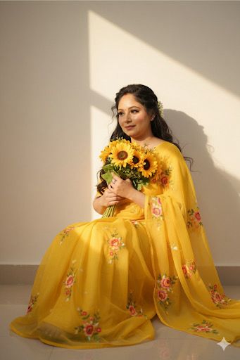 Create A soft, sunlit portrait of [your facel wearing a flowing sheer yellow saree with delicate floral embroidery. She sits gracefully against a plain wall, bathed in warm natural light with a triangular patch of sunlight casting artistic shadows. She holds a vibrant bouquet of sunflowers close to her chest, and a small white flower is tucked behind her ear. Her gentle expression, loose hair strands moving slightly, and the dreamy golden glow create a serene, poetic, and romantic